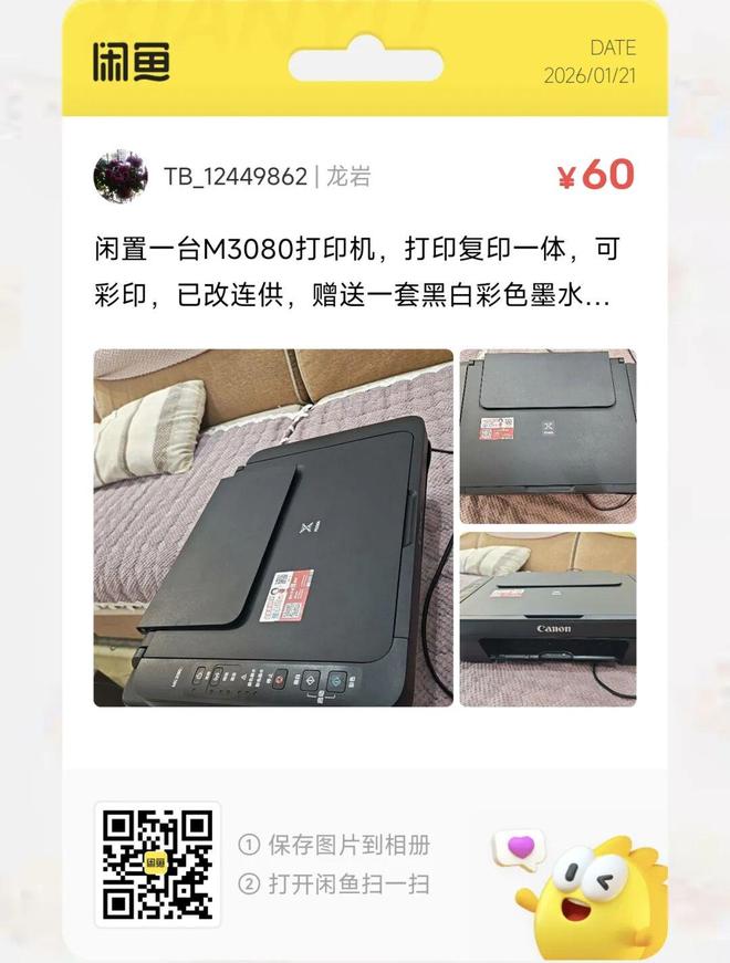 粉丝爆料分享了一台价格60元的M3080打印机,打印复印一体,可彩印,已改连供,赠送一套黑白彩色墨水