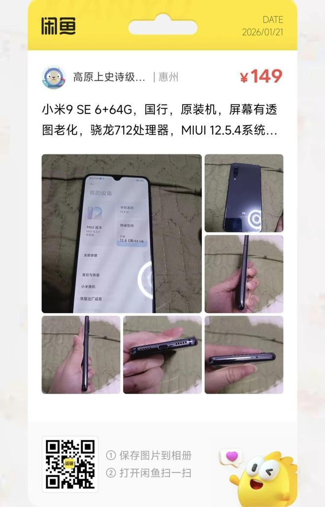 粉丝爆料分享了一台价格149元的小米9 SE 6+64G,国行,原装机,屏幕有透图老化,骁龙712处理器,MIUI 12.5.4系统,5.97英寸屏幕