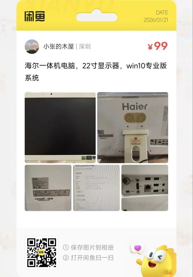 粉丝爆料分享了一台价格99元的海尔一体机电脑,22寸显示器,win10专业版系统